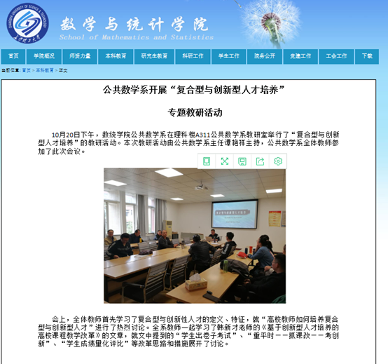 (通讯员 马科)“10月20日下午,数统学院公共数学系,举行‘复合型与创新型人才培养’的教研活动。会上,全体教师首先学习了复合型与创新性人才的定义、特征,就“高校教师如何培养复合型与创新型人才”进行了热烈讨论。全系教师一起学习了韩新才老师的《基于创新型人才培养的高校课程教学改革》的文章,就文中提到的“学生出卷子考试”、“重平时——抓课改——考创新”、“学生成绩量化评比”等改革思路和措施展开了讨论”。