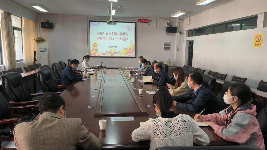 本网讯(通讯员 邓炜)11月2日,环境生态与生物工程学院党委理论学习中心组(扩大)传达学习党的二十大精神会议在四教306会议室召开。学院党委书记孔海霞主持会议,学院领导班子成员、党支部书记和人才发展中心主任参加。