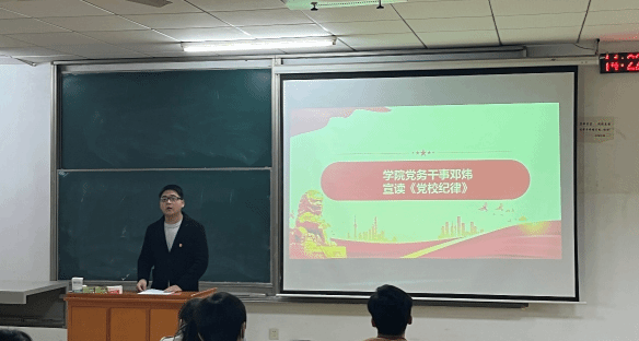 学院党务干事邓炜老师宣读了《党校纪律》。他强调培训班学员要认真学习党的知识,用理论武装头脑;严格遵守党校纪律,完成各项培训任务。